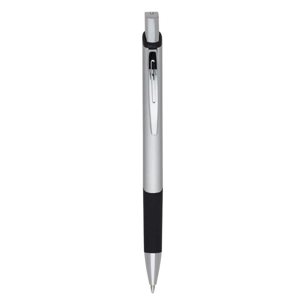 Caneta metálica com design quadrangular, acabamento brilhante (exceto a prata) e detalhe emborrachado, carga esferográfica azul 1.0 mm e acionamento por clique.