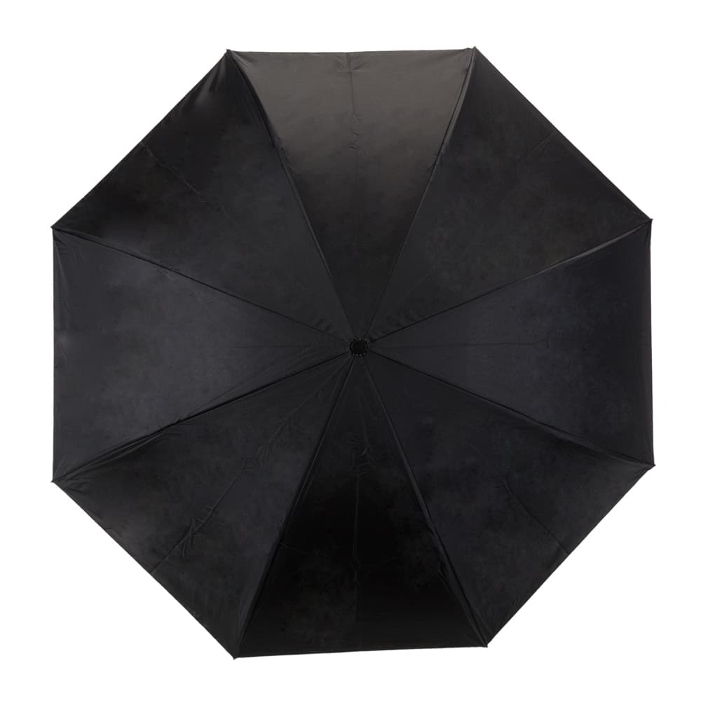 Guarda-chuva invertido com forro interno. Tecido de nylon impermeável preto, possui um mecanismo inovador permitindo que o usuário não se molhe ao entrar e sair de ambientes devido sua abertura invertida, quando feito o movimento para fechar as varetas inverterão para cima criando um formato circular impedindo a chuva de atingir o usuário, podendo “segurar” a chuva enquanto entra/sai de um ambiente e depois virando o guarda-chuva irá escorrer a água. Forro interno para preservação das 8 varetas, evitando contato com a água e assim prolongando seu tempo de uso sem enferrujar. Ao impulsionar o fechamento invertido fica mais rápido e prático o modo de secar e ser guardado, pode ser apoiado no chão que permanecerá em pé para escorrer a água. Pegador plástico fosco em formato C, botão acionador vermelho e fita com velcro(contorno marrom) para lacre.