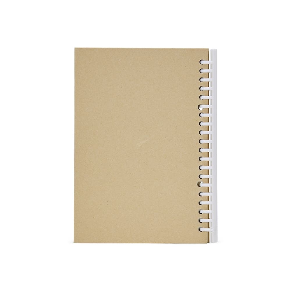 Caderno A5 com capa dura em kraft e espiral removível, contém aproximadamente 87 folhas marfim com pauta.
