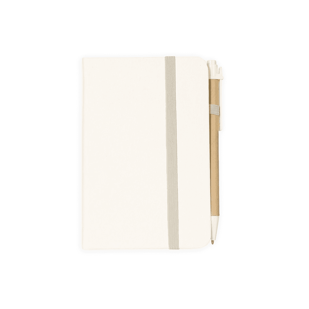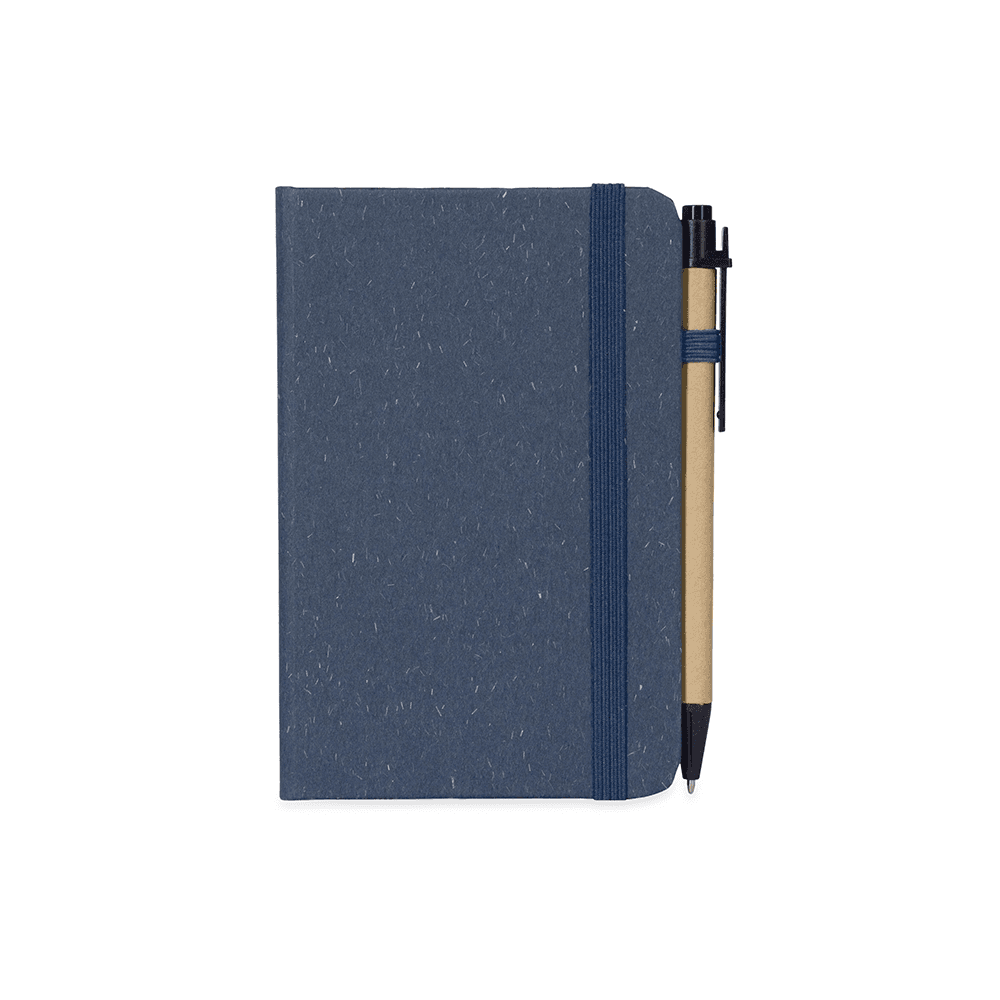 Caderneta ecológica de capa dura revestida em fibra de palha de trigo. Contém aproximadamente 80 folhas brancas com pauta, além de duas folhas de guarda, uma fita para fechamento e porta-canetas elástico. Acompanha uma caneta esferográfica de carga azul de 1,0mm com corpo em papelão e clip, acionamento por clique e ponteira em plástico.