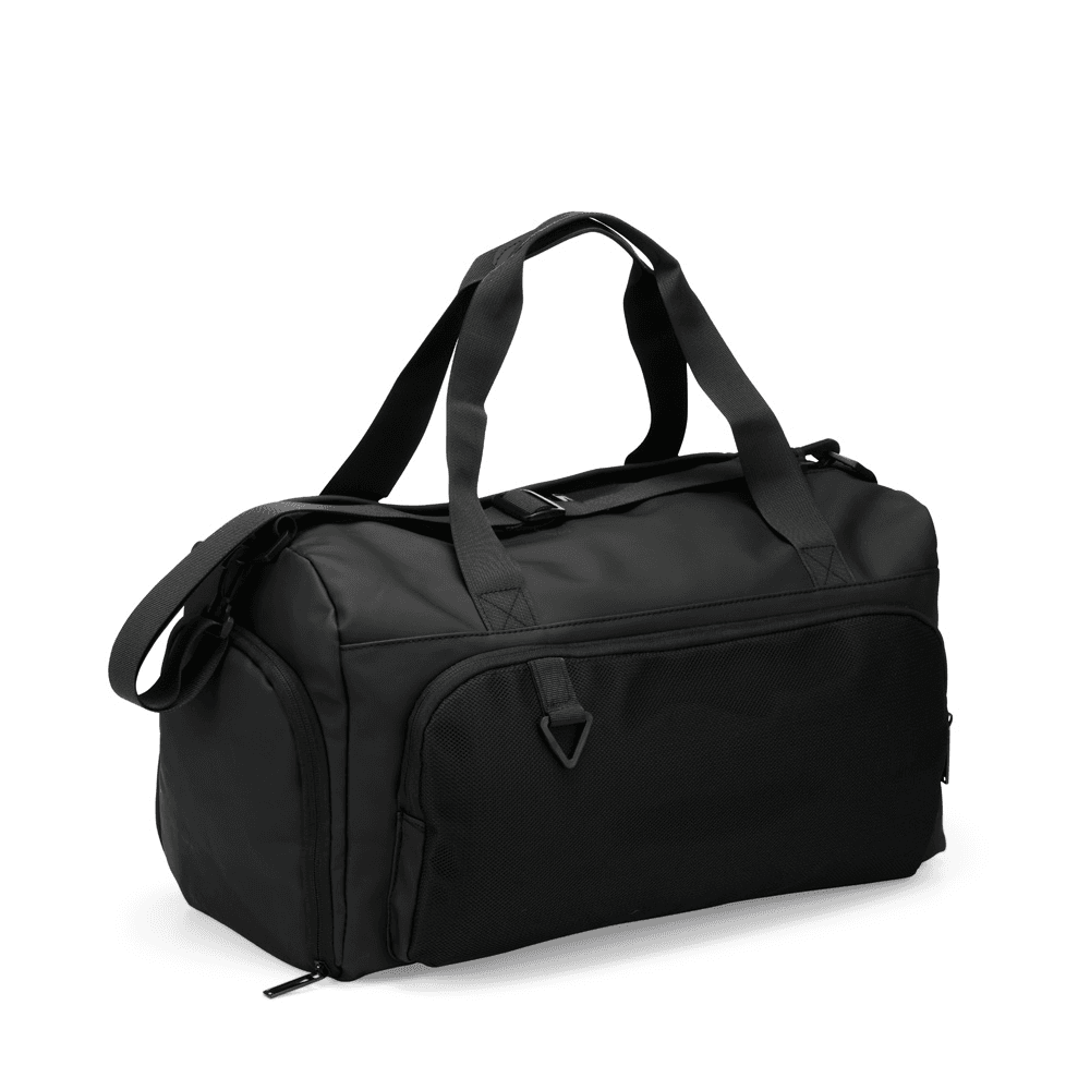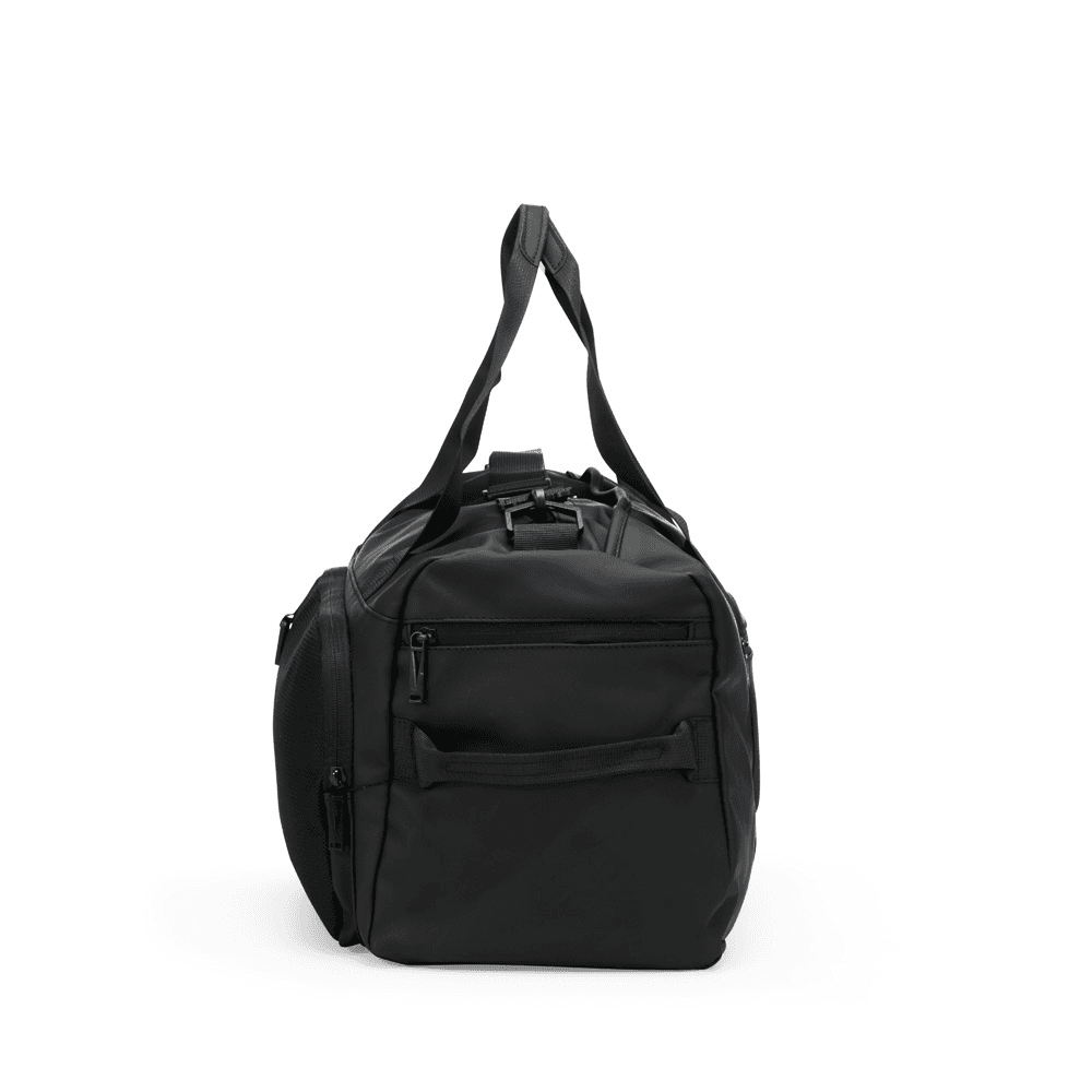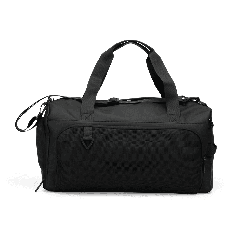 Bolsa confeccionada em couro sintético com capacidade de até 32 litros. Apresenta compartimento interno com bolso de zíper e outros dois bolsos abertos. Conta ainda com cinco compartimentos externos em diferentes tamanhos, incluindo um lateral dedicado para tênis, um bolso menor com encaixe para malas e outro para itens molhados. Possui duas alças de mão e alça transversal removível.