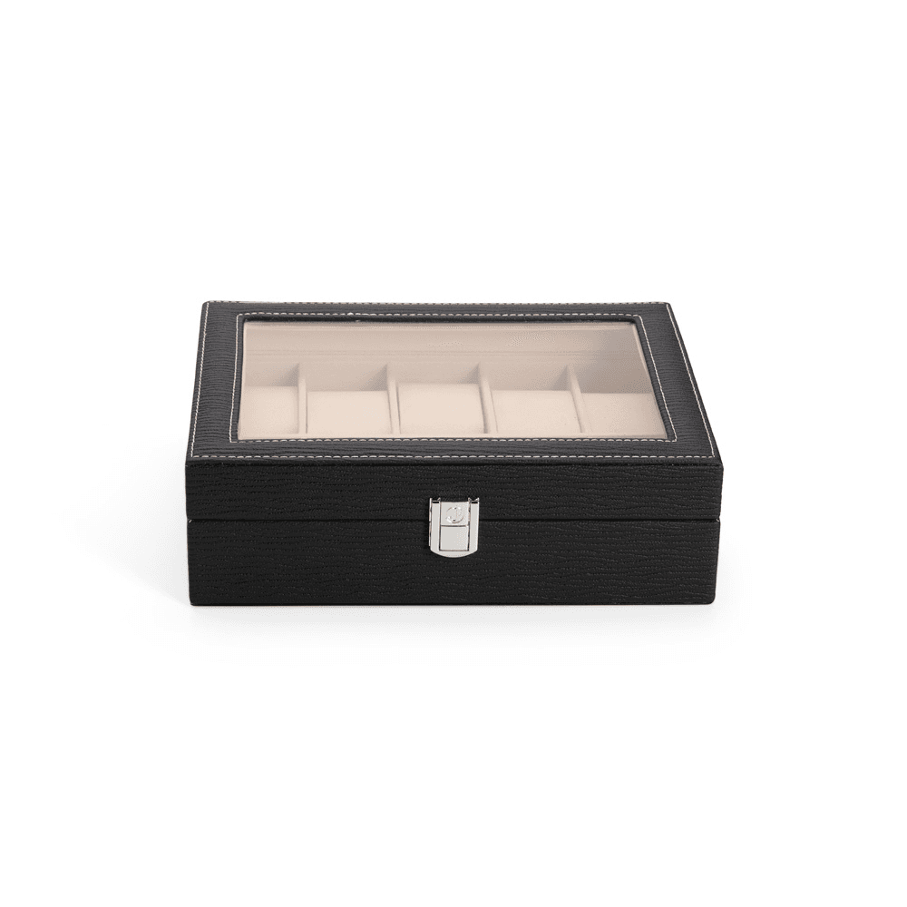 Porta-relógios com acabamento texturizado em couro sintético à base de PVC e revestimento interno em tecido aveludado. Possui dez divisórias com almofadas removíveis, visor de vidro e trava de segurança na tampa.