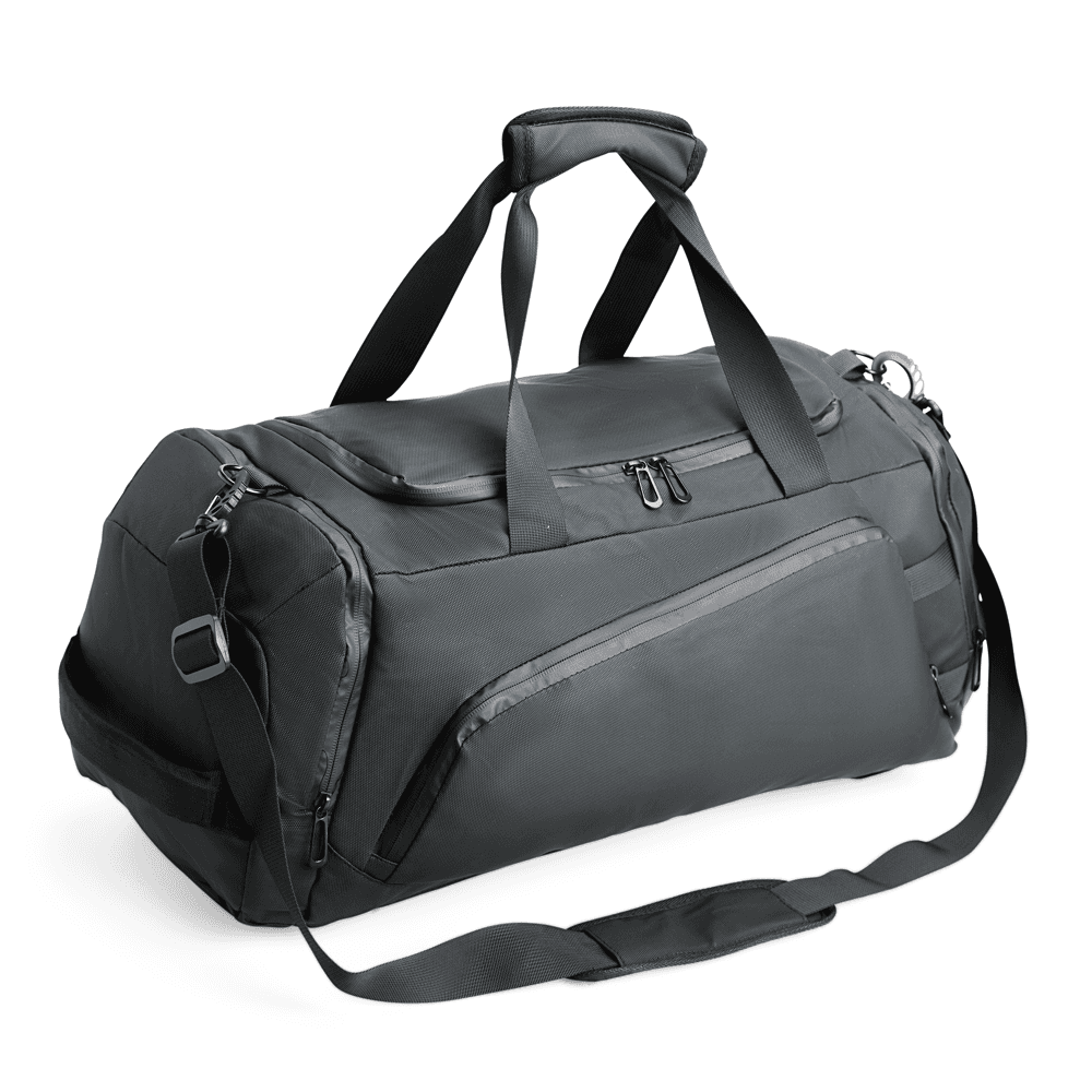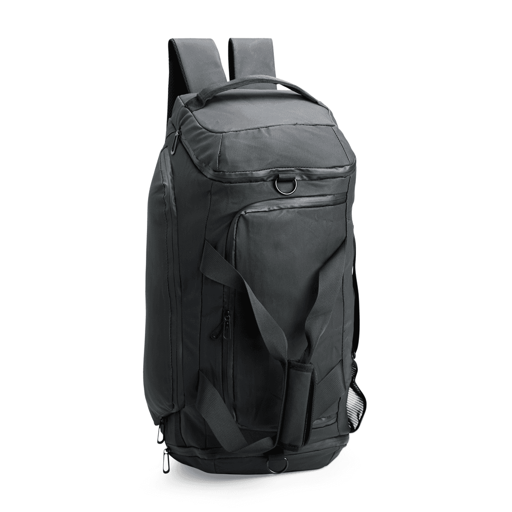 Bolsa confeccionada em filme sintético tipo couro impermeável com capacidade de até 35 litros. Possui compartimento interno amplo dois bolsos em tela e fechamento em zíper, além de quatro bolsos externos de tamanhos variados e fechamento em zíper e um em tela com elástico. Apresenta alças de mão com suporte de juntura e um par de alças ocultas na parte inferior da bolsa, que permitem seu uso como mochila. Contém alça transversal removível.