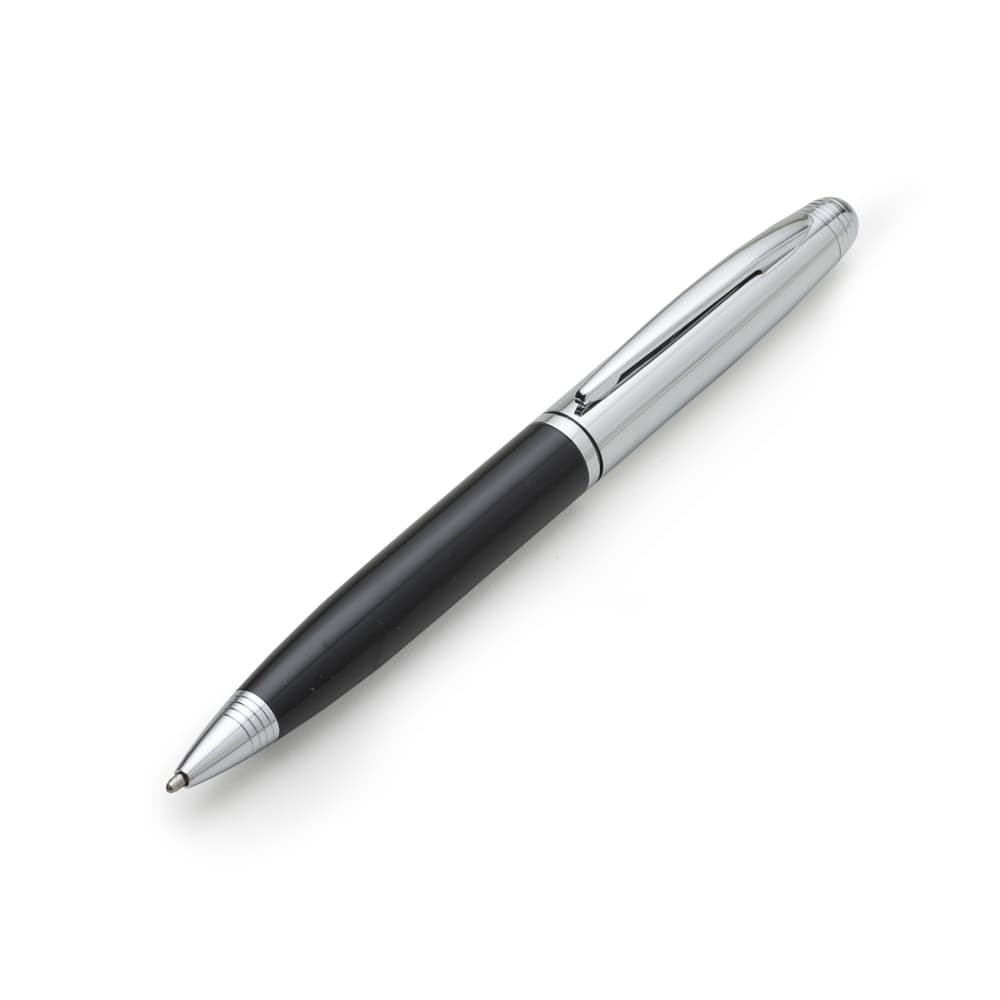 Caneta metálica com carga esferográfica azul e acionamento por rotação.