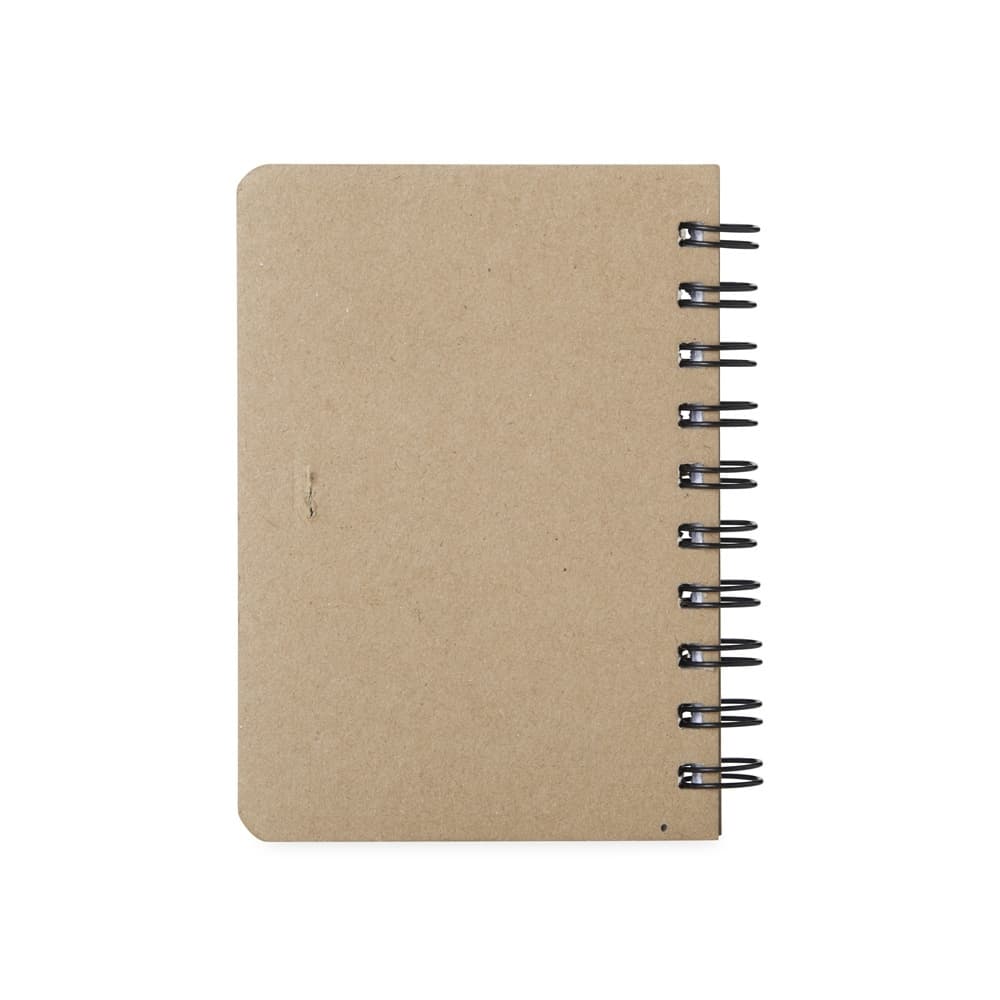 Caderno capa dura em kraft com wire-o e porta caneta. Contém aproximadamente 100 páginas não pautadas na cor branca.