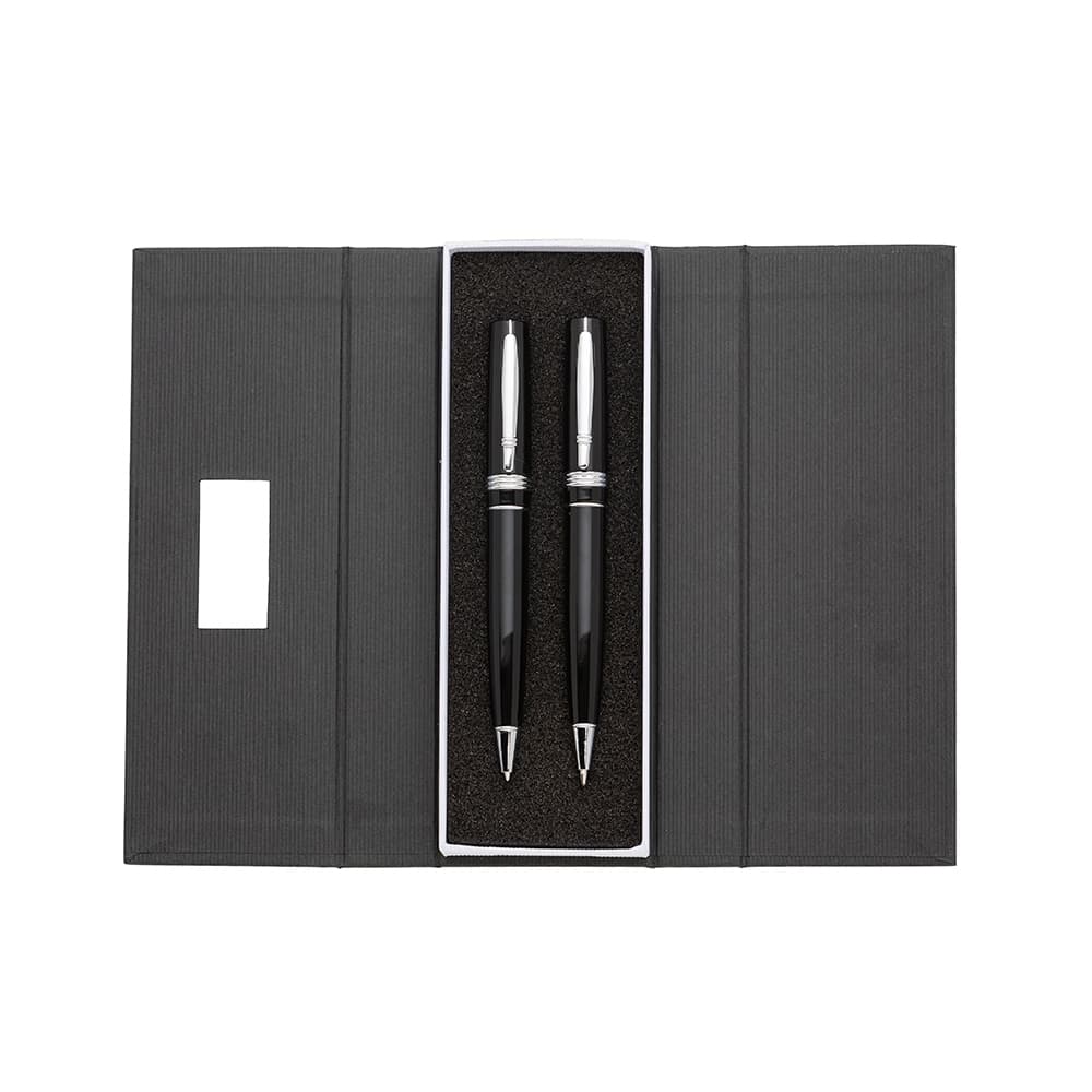 Conjunto caneta e lapiseira em estojo de cartonagem com placa central para personalização. Caneta/Lapiseira metal inteira colorida com detalhes prata, clip metal com duas “linhas” e na “ponta” superior detalhe de uma linha no meio. Possui três anéis abaixo do clip, anel centralizado e anel inferior e acionam por giro. Estojo revestida com espuma na parte interna.