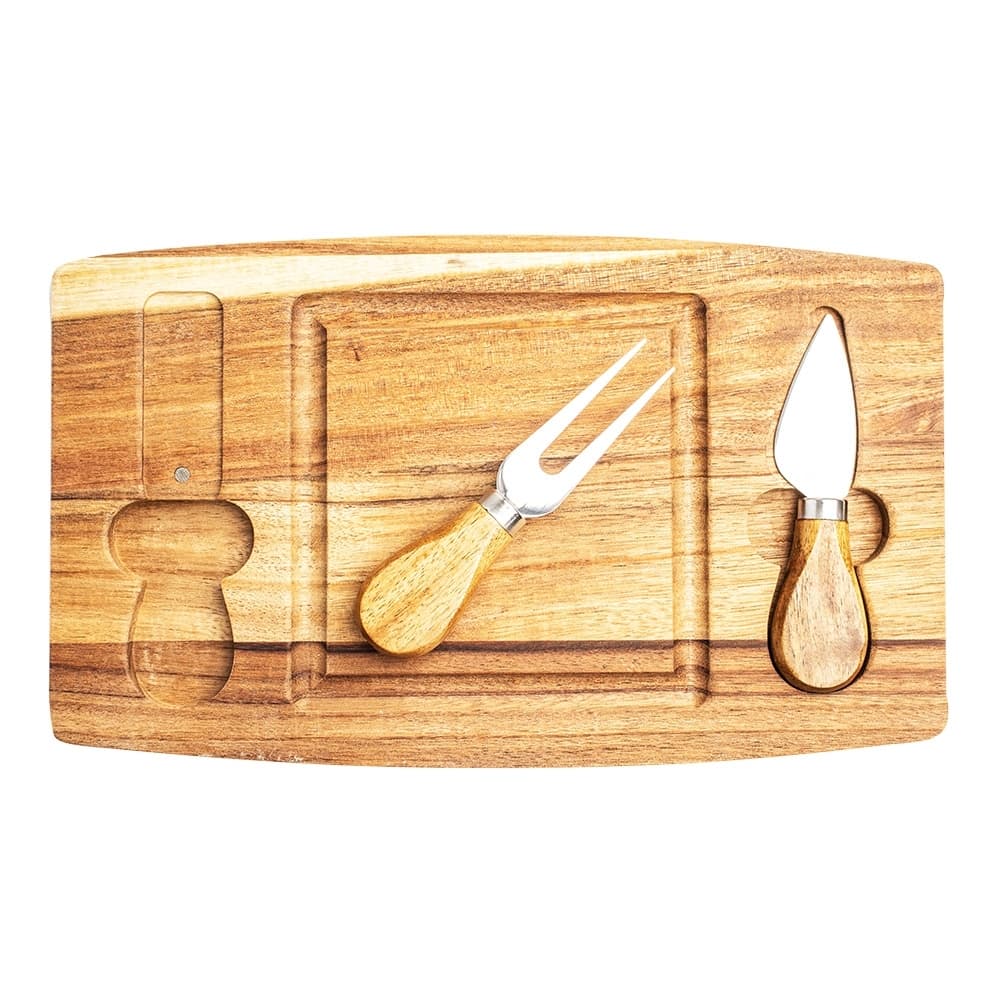 54293 HAVEN. Tábua de queijos em madeira de acácia com 2 utensílios em madeira de acácia e aço inox