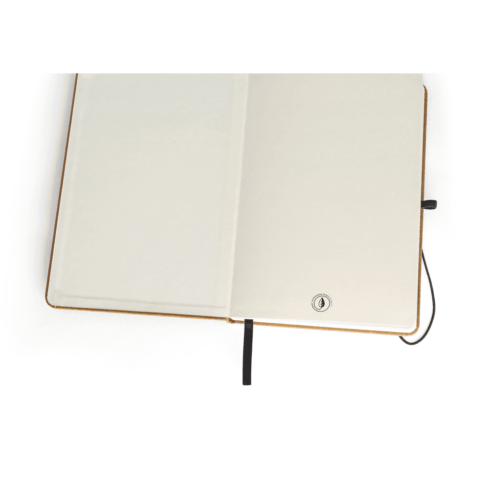 Caderno A5 de capa dura em couro 70% reciclado. Contém 192 páginas pautadas cor marfim em papel proveniente de gestão florestal sustentável, suporte para esferográfica (não inclusa), elástico e fita separadora em preto. Contém bolso interior. 140 x 210 mm