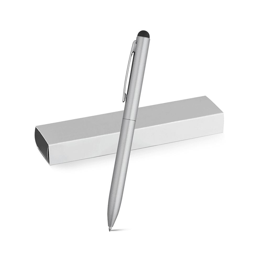 Esferográfica em alumínio com clipe de metal. A esferográfica tem mecanismo twist, ponteira touch em silicone e escrita em azul até 1,5 km. Fornecido em caixa presente desmontada. ø10 x 142 mm | Caixa: 175 x 41 x 20 mm
