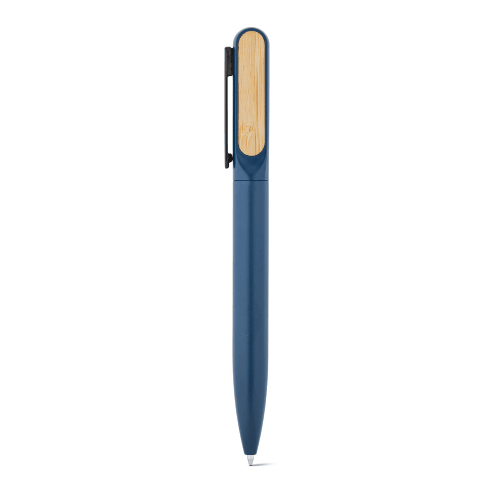 Esferográfica em alumínio 94% reciclado com detalhe em bambu no clipe. Escrita em azul até 1,5 km. Fornecida em bolsa de oferta. A cor e o resultado da impressão nos materiais naturais pode variar entre produtos. ø12 x 140 mm | Bolsa: 40 x 155 mm