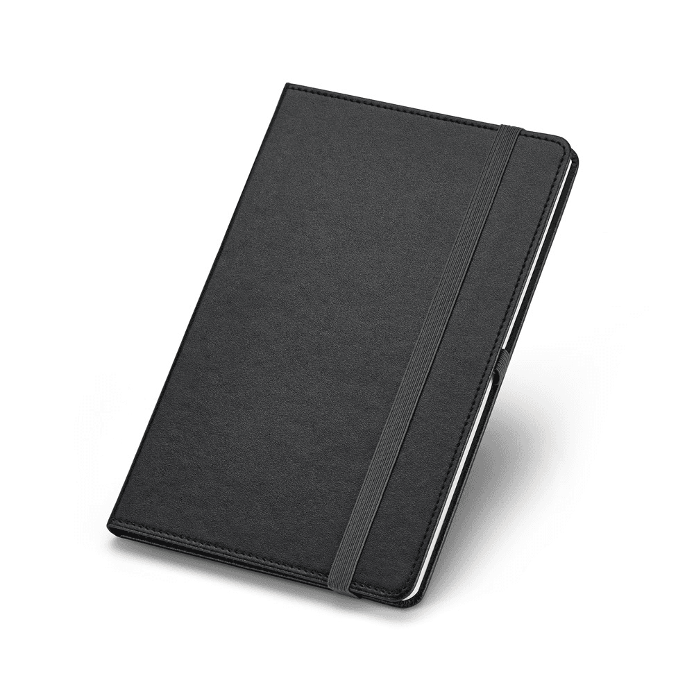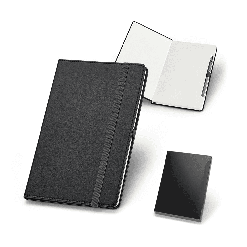 Caderno A5 de capa dura em c. sintético. Contém 192 páginas lisas, fita separadora, elástico e suporte para esferográfica. Incluso esferográfica de metal com escrita em azul. Fornecida com caixa presente. 139 x 216 mm | Caixa: 145 x 220 x 15 mm