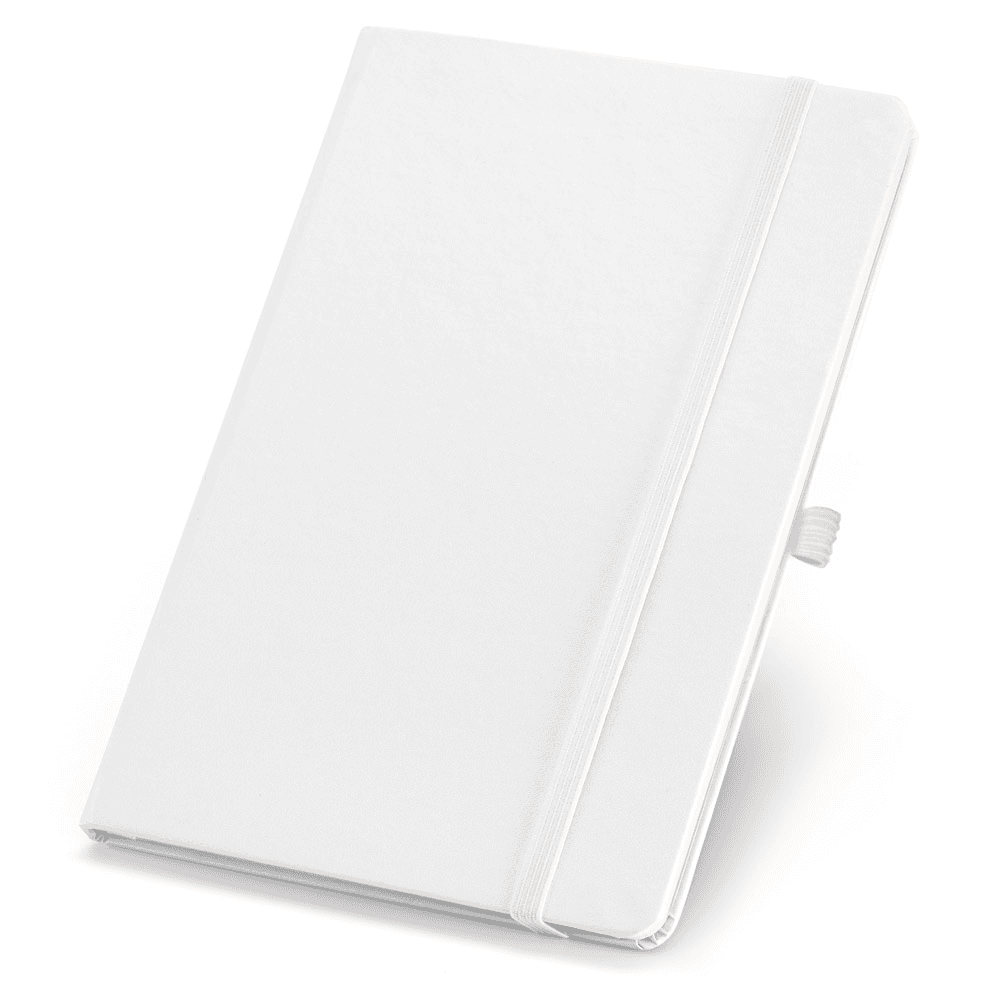 Caderno B6 de capa dura com 160 páginas lisas em cor marfim, suporte para esferográfica (não inclusa) e bolso interior. 120 x 180 mm