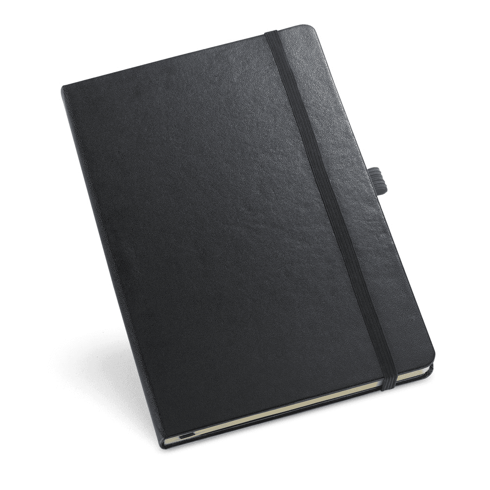 Caderno A5 de capa dura com 160 páginas pautadas em cor marfim, suporte para esferográfica (não inclusa) e bolso interior. 137 x 210 mm