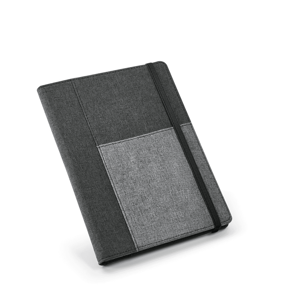 Capa de tecido em poliéster, com caderno A5 removível com 160 páginas lisas. O interior contém um bolso interior e suporte para esferográfica (não inclusa). Fornecida em embalagem de non-woven. 160 x 220 mm | Bolsa: 205 x 250 mm