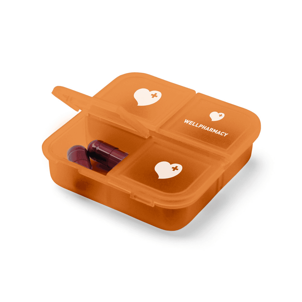 Porta comprimidos com 4 divisórias com tampa, disponível em várias cores. Certificação EU Food Grade. 60 x 60 x 18 mm
