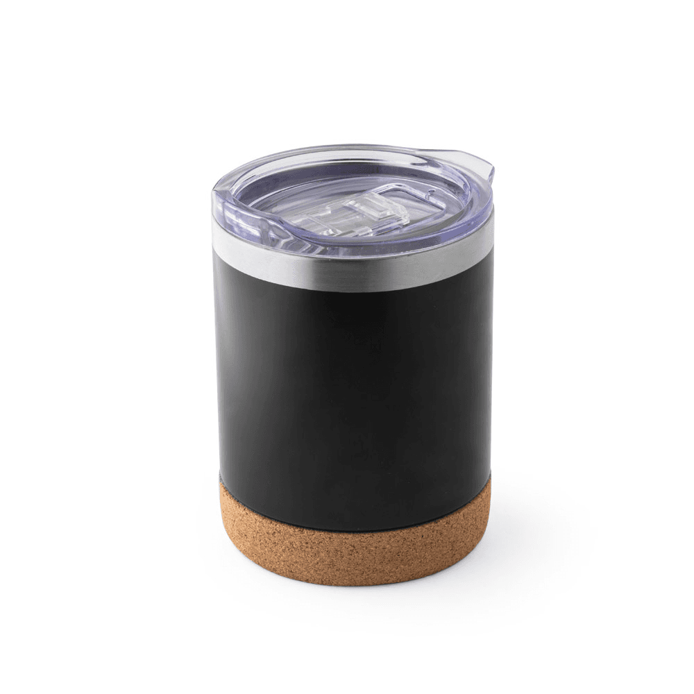 Copo de viagem em aço inox térmico, com parede dupla isolada a vácuo. Capacidade até 400 mL. Parede com acabamento fosco e base em cortiça. Contém uma tampa transparente com fecho deslizante. Fornecido em caixa presente de papel kraft reciclado. Certificação EU Food Grade Ø93 x 121 mm