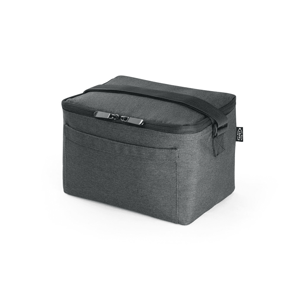Bolsa térmica em poliéster reciclado 600D com interior em PEVA. Alça ajustável em webbing, bolso frontal e fecho duplo. Capacidade até 6 L. Certificação EU Food Grade. 240 x 170 x 170 mm
