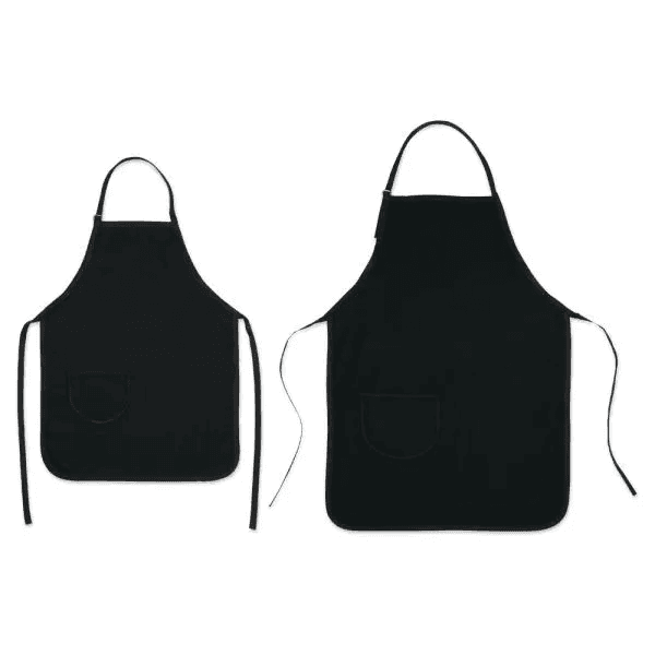 Composto por avental em tamanho padrão e avental em tamanho pequeno. Ambos possuem bolso frontal, tiras para amarrar na cintura e pescoço com regulagem de altura.