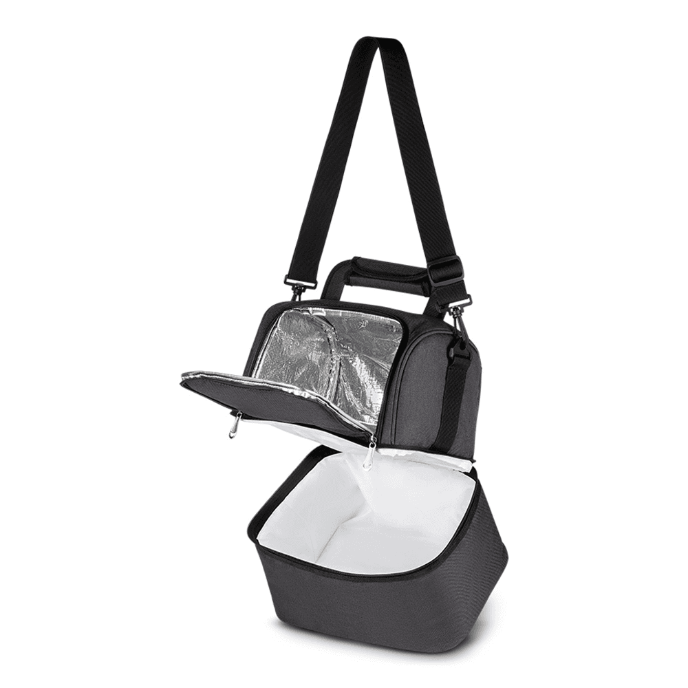 Bolsa térmica em tecido poliéster 600D, bolso frontal, alça de mão, alça de ombro regulável com 2 compartimentos térmicos, com capacidade de até 7 litros na parte superior (costurada) e 6 litros na parte inferior (soldada), interior parte superior em Polietileno e parte inferior em PEVA.
