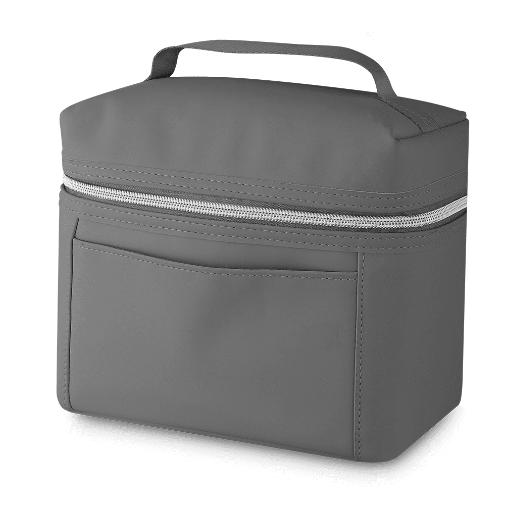 Bolsa térmica em PU com zíper, parte interna costurada, com alça de mão e bolso frontal.