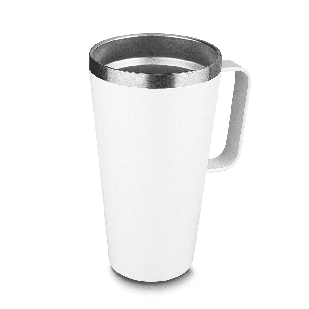 Caneca térmica em aço inox com parede dupla isolada à vácuo, tampa plástica e anel em silicone para vedação, alça lateral. Capacidade 530ml, parede externa com pintura a pó.