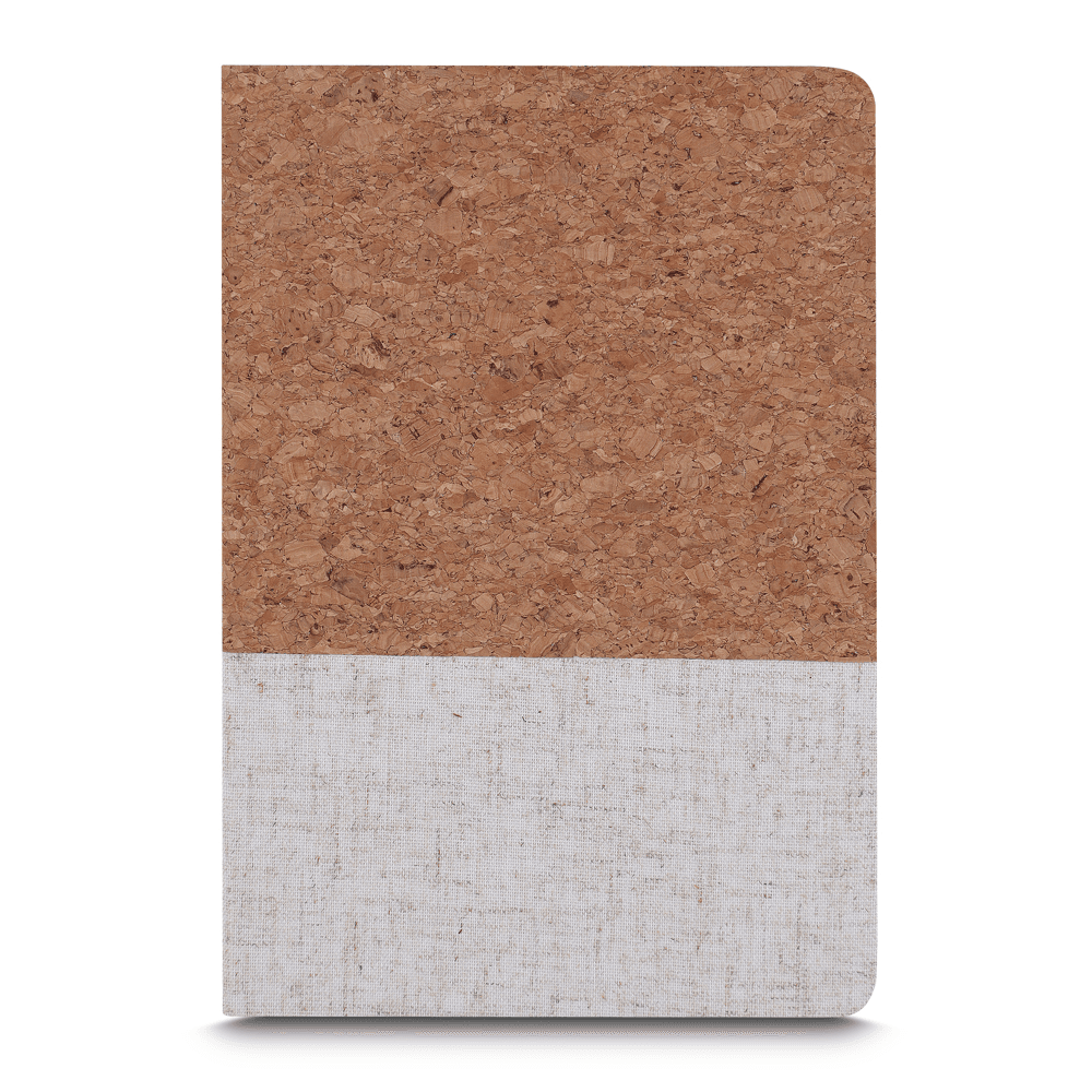 O caderno de anotações é feito de cortiça com detalhe em algodão cru, em capa dura com miolo 80 folhas pautadas.