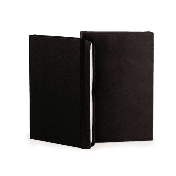 Caderno para anotações preto com capa dura. Conta com 80 folhas não pautadas, marcador de página, porta caneta e elástico para fechamento. Gramatura da folha de 70 g/m2.