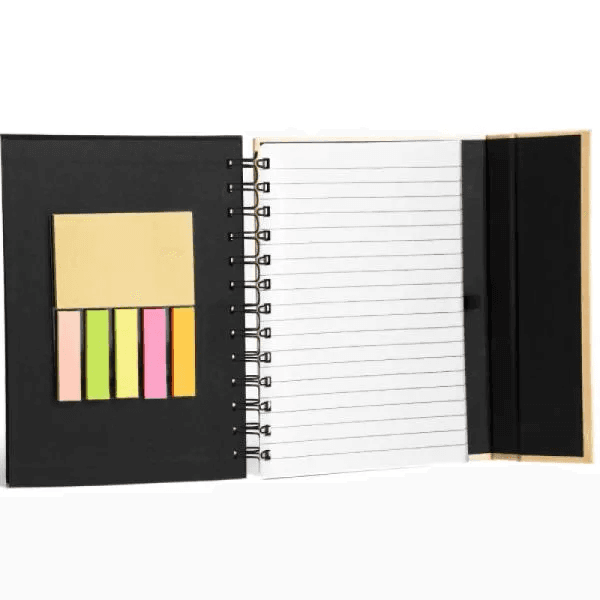 Caderno espiral preto/bege com capa e caneta em Papelão Reciclado rígido, 70 folhas pautadas. Fechamento através de imã na aba. 6 blocos auto colantes, com 25 folhas cada. Caneta com ponta touch e carga esferográfica preta, acionada por click.