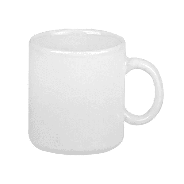 Caneca em cerâmica branca com capacidade total de 270 ml.