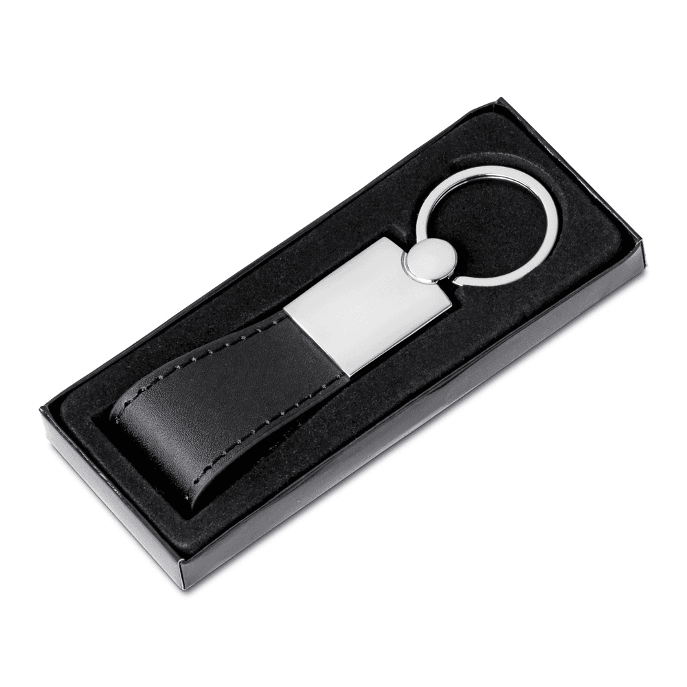 Chaveiro de metal com alça em couro sintético preto em formato trapézio + caixa com berço aveludado