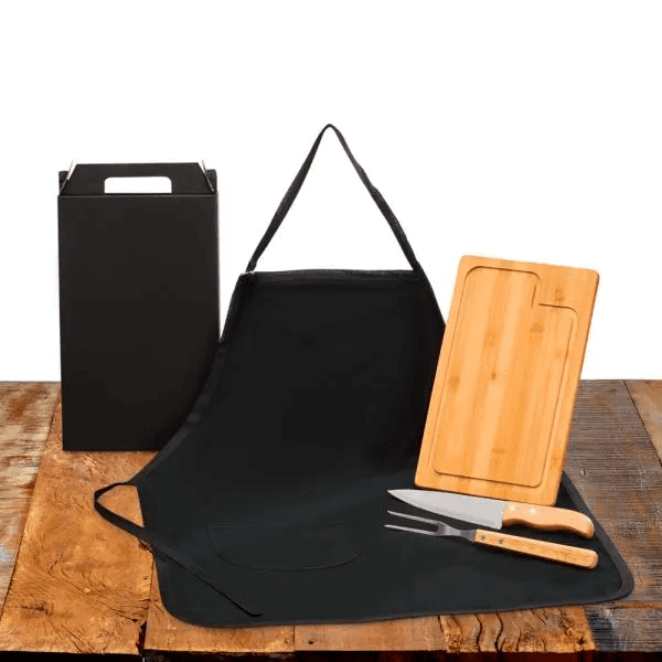 Composto por tábua em Bambu; avental em Brim Preto; faca 7" e garfo em aço Madeira/Inox.