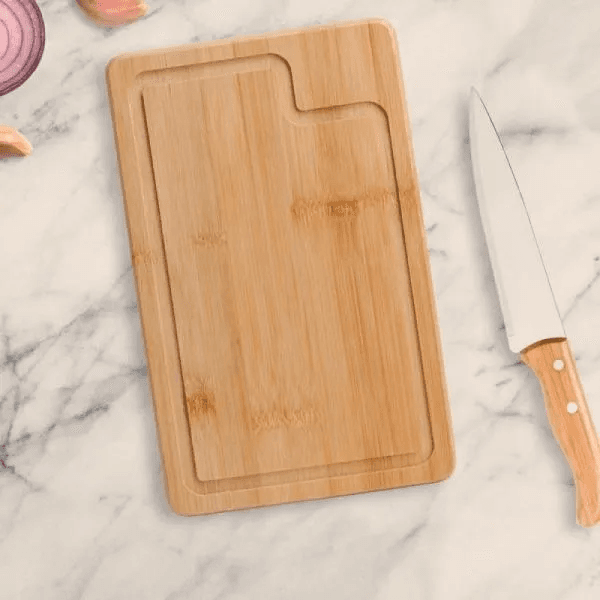 Conjunto composto por uma tábua retangular em tripla camada invertida de Bambu com sulco e uma faca 7” com gravação dos cortes do boi. Cabo em Bambu e lâmina em Aço Inox com rebites resistentes.