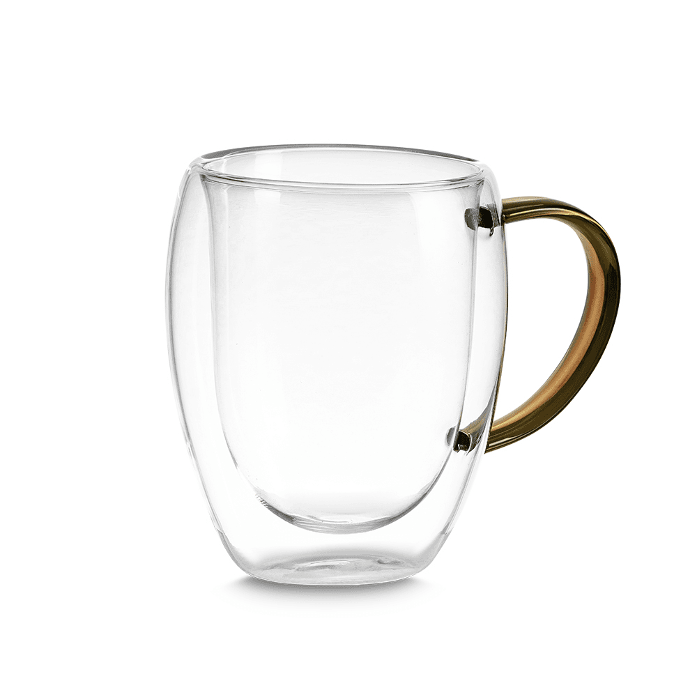 Caneca de vidro borossilicato com parede dupla, com capacidade de até 350ml.