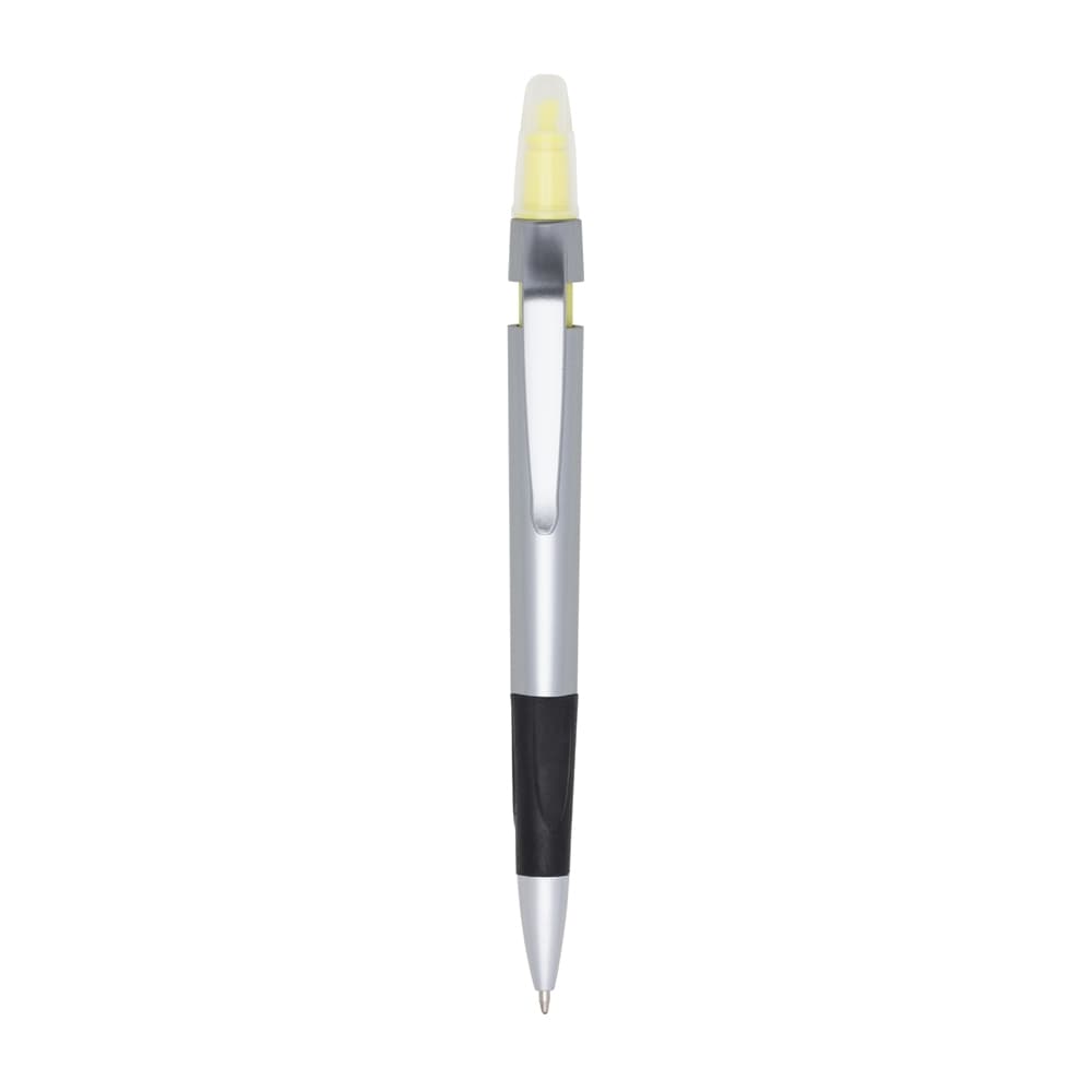 Caneta plástica com marca texto, contém detalhe emborrachado e tampa protetora para o marca texto. Carga esferográfica azul 1.0 mm e acionamento por clique.