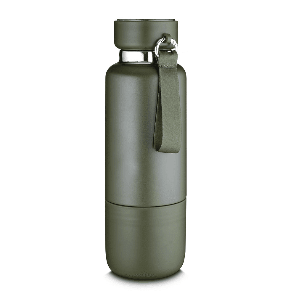 Garrafa térmica em aço inox com parede dupla isolada a vácuo e capacidade de 500ml. Alça de transporte em cordão. Tampa rosqueável, vedada por um anel de silicone e com uma argola tipo mosquetão para o cordão. Parte superior da tampa possui um compartimento para pequenos objetos que acompanha um cordão adicional de 68cm para substituição e cordão de mão com 10cm. Possui copo adicional rosqueável na parte inferior da garrafa de 250ml. Pintura fosca.