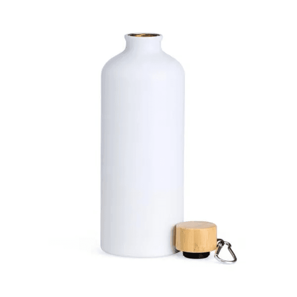 Garrafa em alumínio na cor branca com capacidade de 1 litro. Possui tampa rosqueável em Bambu com mosquetão.