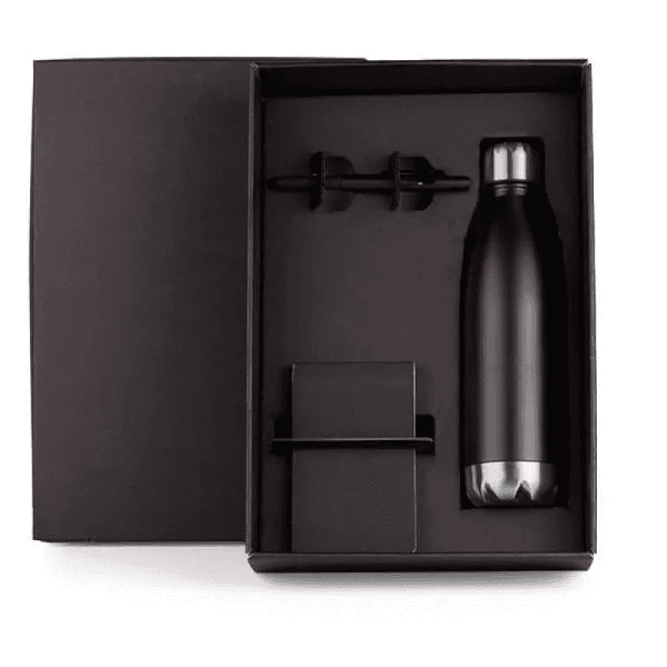 Kit bloco para anotações e acessórios. Conta com garrafa em aço Inox preta com tampa rosqueável; bloco para anotações preto e caneta esferográfica em ABS preta.