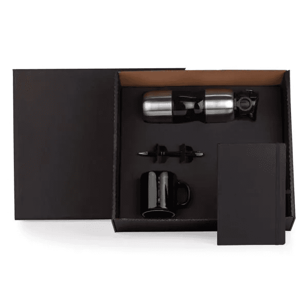Kit boas vindas. Conta com garrafa 750ml revestida em aço inox; caneca em cerâmica 270ml; caderneta sem pauta; caneta esferográfica em alumínio com ponta touch.
