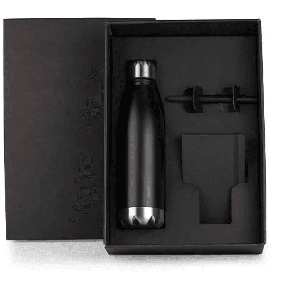 Conta com garrafa em aço inox preta com tampa rosqueável contendo a capacidade total de 750ml; caderno para anotações preto com capa dura e caneta esferográfica em ABS preta.