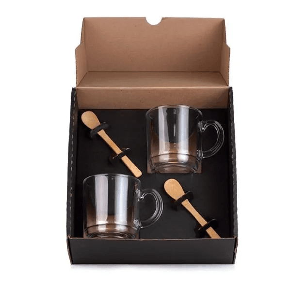 Kit contendo duas canecas de vidro e duas colheres em bambu.