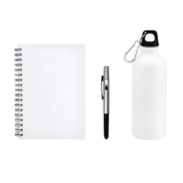Composto por squeeze branco em alumínio revestido com verniz; caderno para anotações wire-o branco com capa dura e caneta esferográfica em ABS prata.