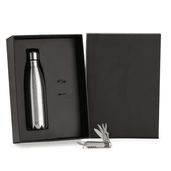 Composto por garrafa em Aço Inox prata com tampa rosqueável e canivete confeccionado em aço Inox escovado e três detalhes externos emborrachados nos dois lados.