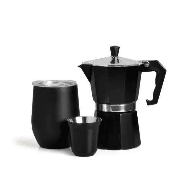 Kit para café. Conta com cafeteira prensa francesa e dois copos para café em aço inox preto, um de 80ml e outro de 340ml com tampa.