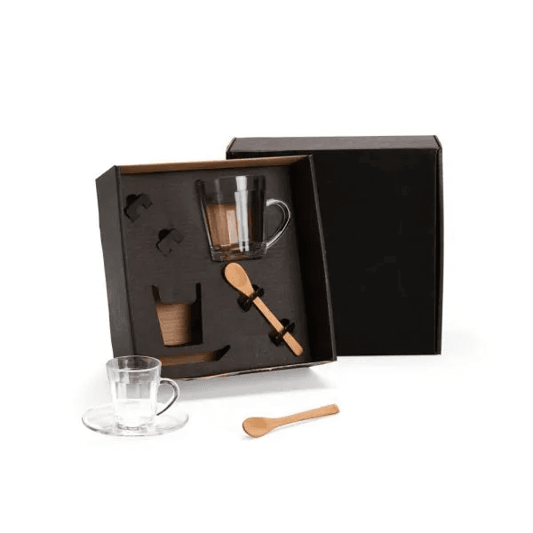 Composto por caneca americano e xícara express americano com pires em vidro. Conta também com duas colheres de 13 cm em Bambu.