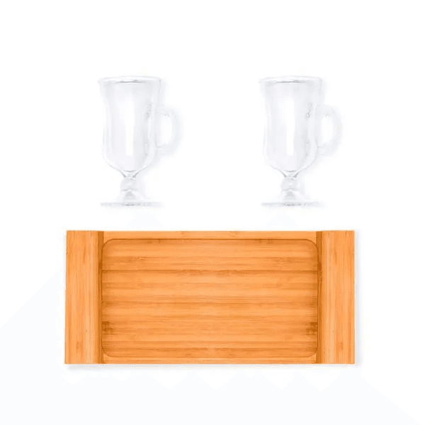 Kit para cafézinho; Conta com bandeja em bambu; Duas canecas em vidro 130ml cada. Estão perfeitamente acomodados em uma caixa para presentear.