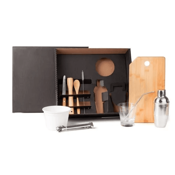 Kit para Caipirinha. Composto por tábua com 1 furo, colher de 18cm e socador em Bambu; faca 4" em Madeira/Inox; coqueteleira, canudo, escova para canudo e pegador para gelo em aço Inox; copo em vidro e balde para gelo 750 ml em alumínio branco.