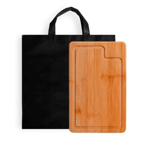 Kit para churrasco/cerveja com sacola. Conta com tábua em bambu; faca 7" e garfo em aço madeira/inox; sacola preta em TNT com alças; copo térmico com tampa e abridor de garrafas.