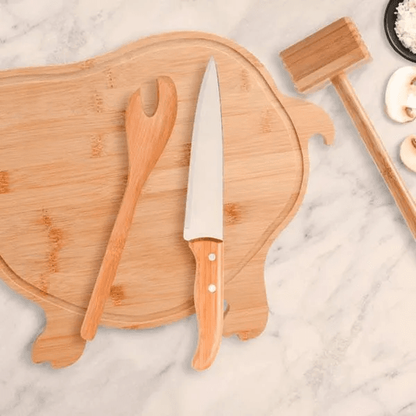 Kit para Cozinha em Bambu/Aço Inox; Conta com tábua em formato de porco, pegador 22cm e martelo em Bambu; Faca 7'' em Bambu/Inox. Tábua confeccionada com tripla camada invertida, para dar maior durabilidade.