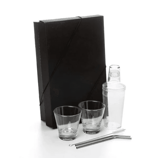 Conta com dois copos de vidro; Dois canudos, escova em aço/inox e coqueteleira em PS.