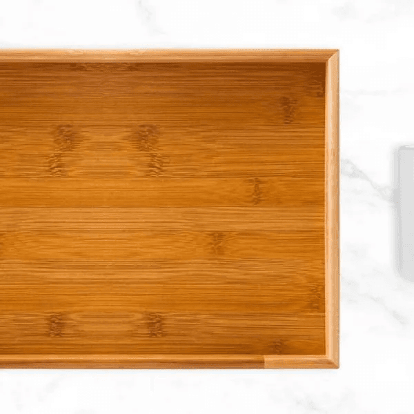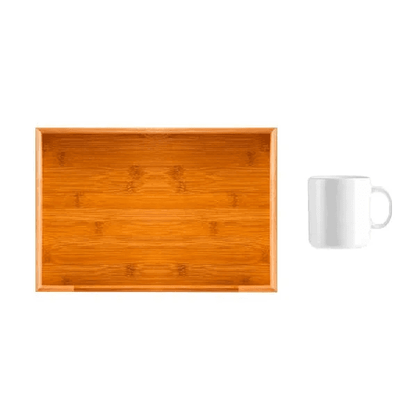 Kit para servir. Conta com bandeja em bambu e caneca em cerâmica. Estão perfeitamente acomodados em uma caixa para presentear.